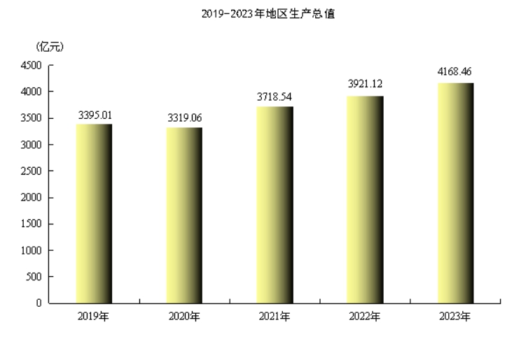 根据生产总值统一核算结果,2023年实现地区生产总值(GDP)4168.46亿元,按不变价计算,比上年增长6.0%。其中:第一产业增加值33.12亿元,增长13.7%;第二产业增加值1146.74亿元,增长0.9%;第三产业增加值2988.60亿元,增长7.8%。三次产业结构为0.8:27.5:71.7。人均地区生产总值102078元。