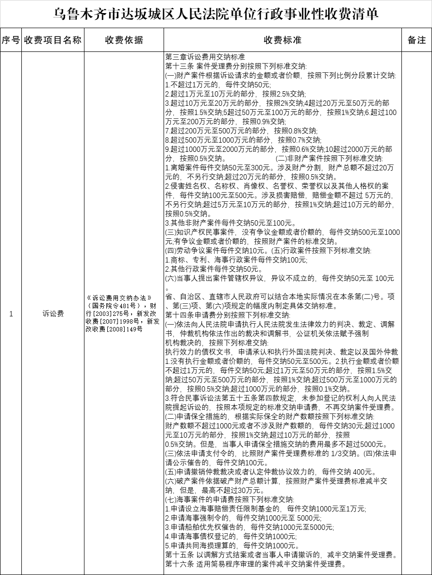 乌鲁木齐市达坂城区人民法院单位行政事业性收费清单