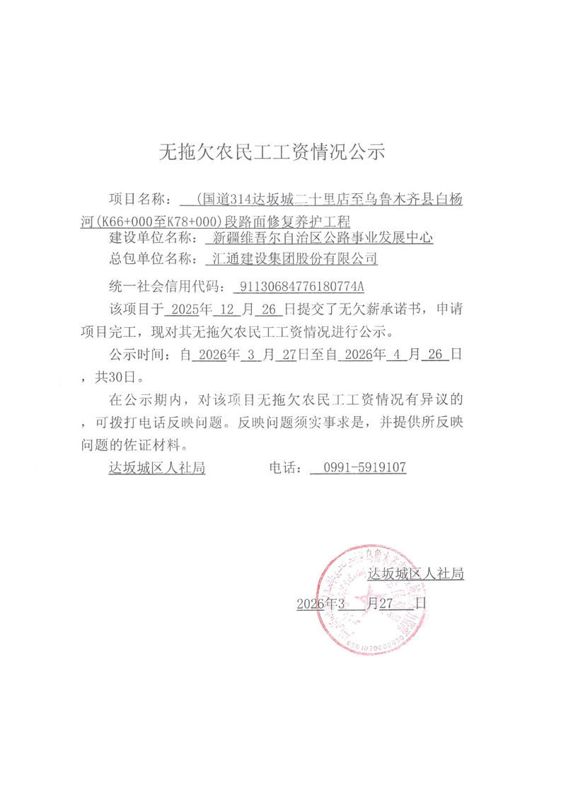 无拖欠农民工工资情况公示(汇通建设集团股份有限公司)