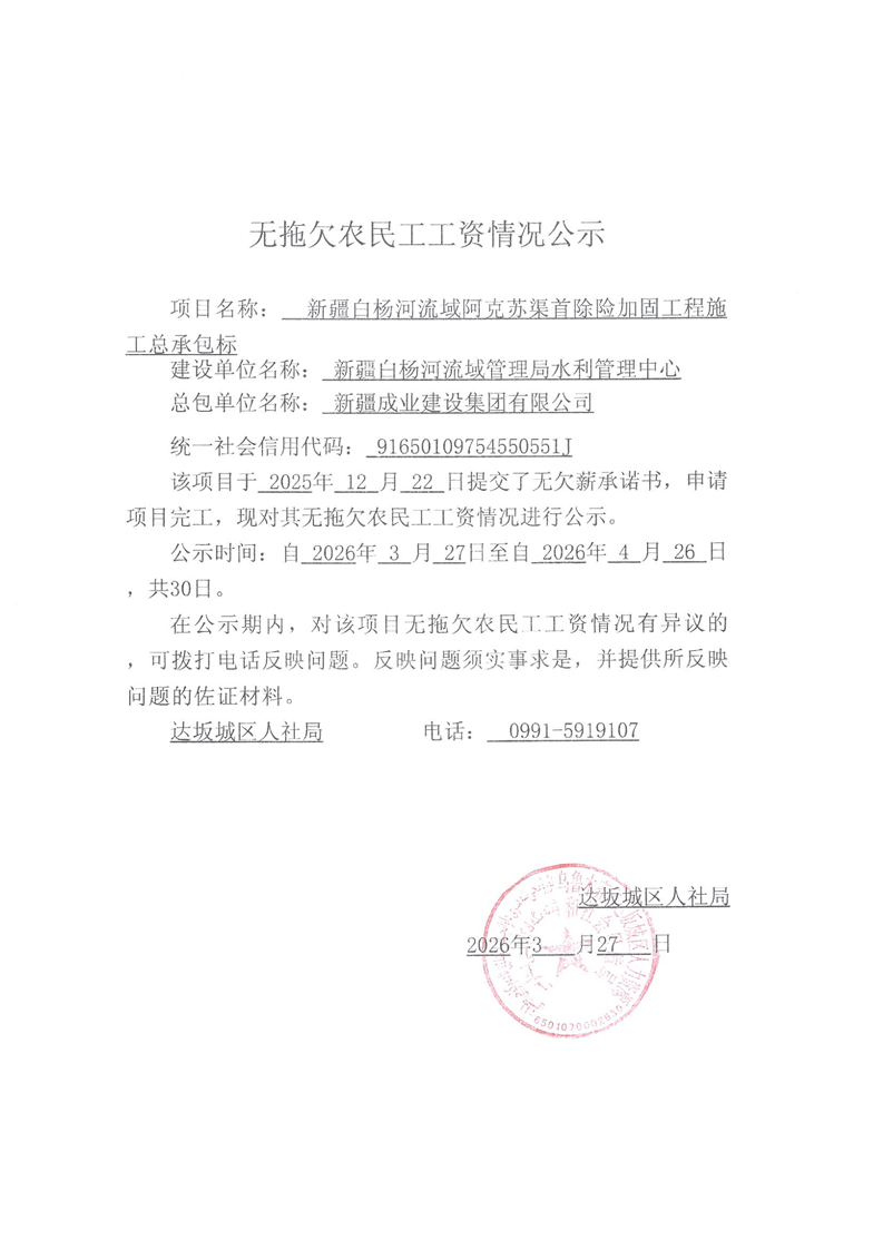 无拖欠农民工工资情况公示(新疆成业建设集团有限公司)