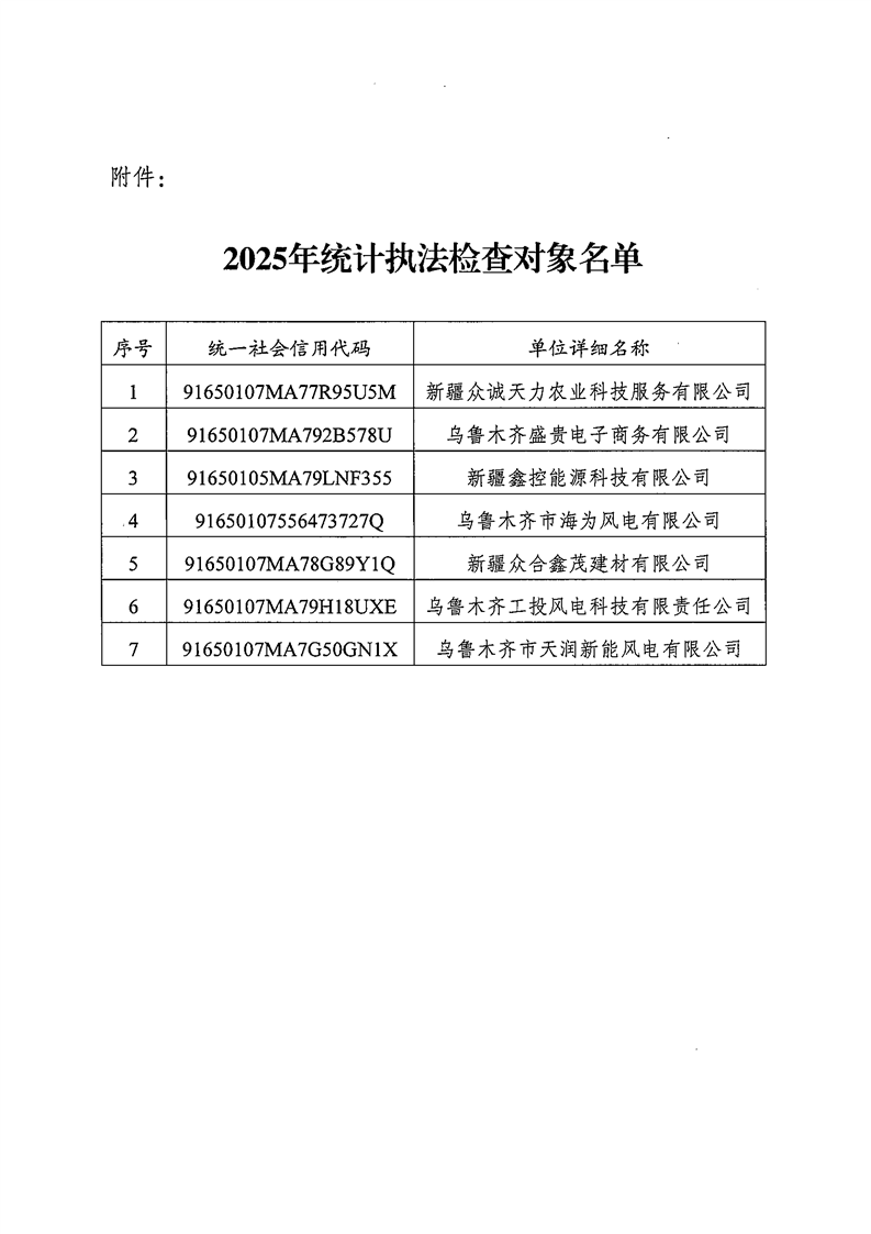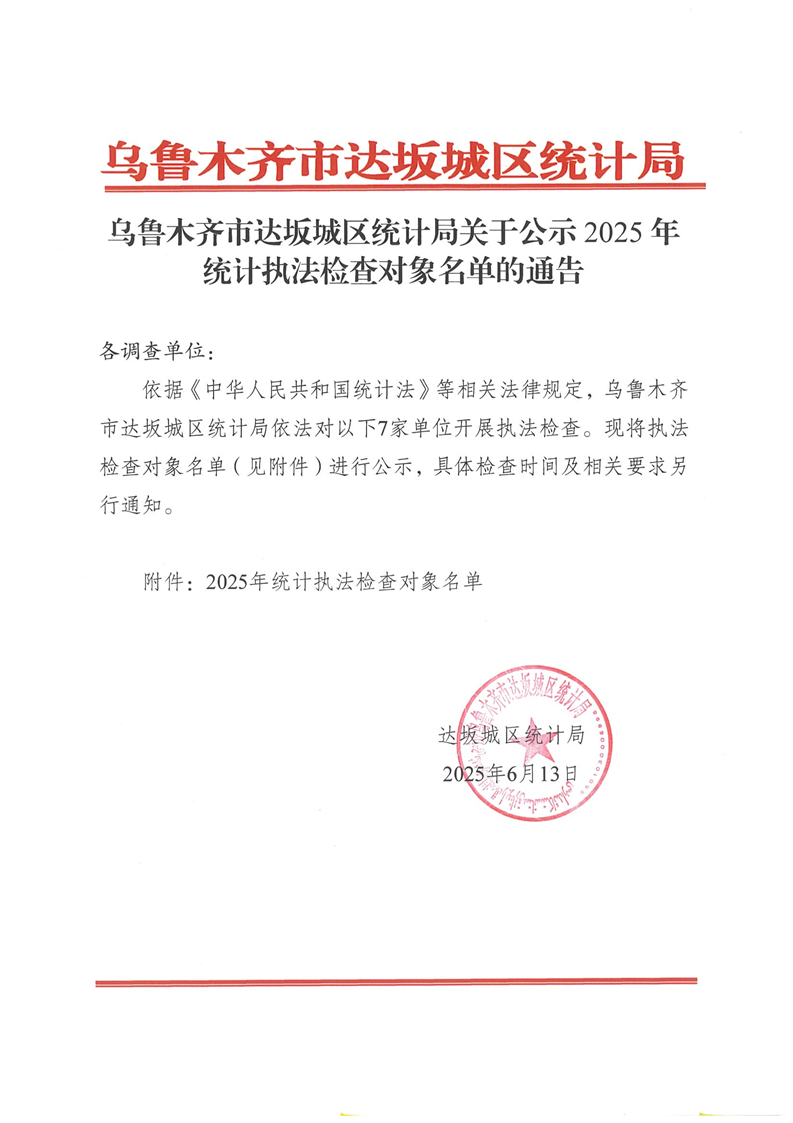 乌鲁木齐市达坂城区统计局关于公示2025年统计执法检查对象名单的通告