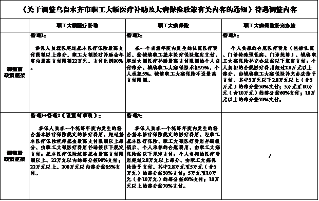根据医疗保障待遇清单要求,结合实际情况,将乌鲁木齐市职工大额医疗补助、职工大病保险和职工大病保险补充办法调整为职工大额医疗费用补助和职工大病保险。此次调整是对职工补充保险框架结构的调整,不增加单位和个人负担,待遇享受整体保持不变。具体内容如下: