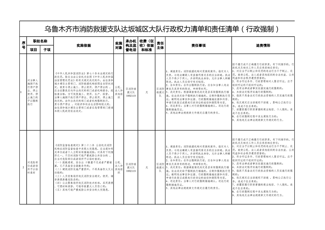 乌鲁木齐市消防救援支队达坂城区大队行政权力清单和责任清单(行政强制)