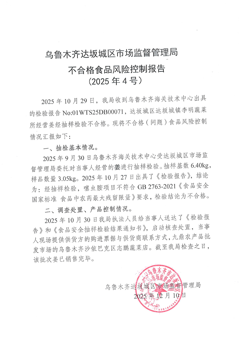 乌鲁木齐市达坂城区市场监督管理局不合格食品风险控制报告(2025年4号)