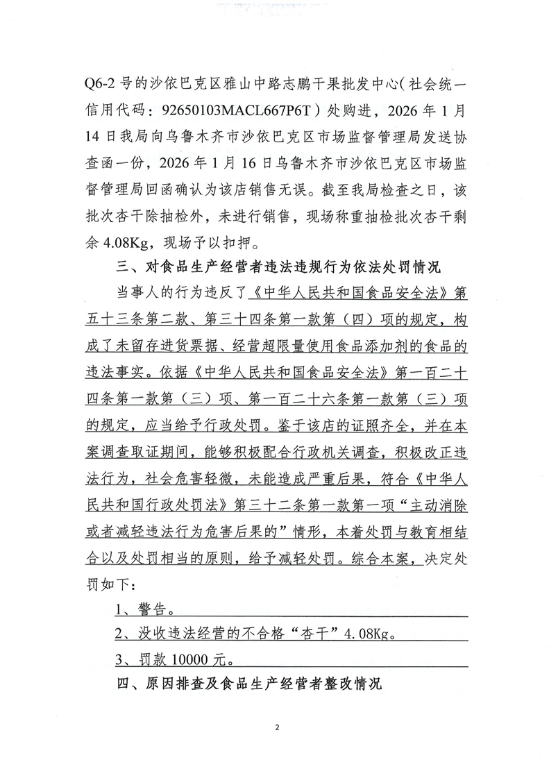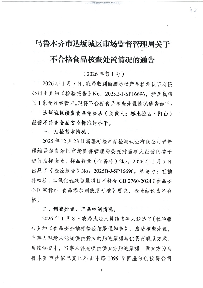 乌鲁木齐市达坂城区市场监督管理局关于不合格食品核查处置情况的通告(2026年第1号)