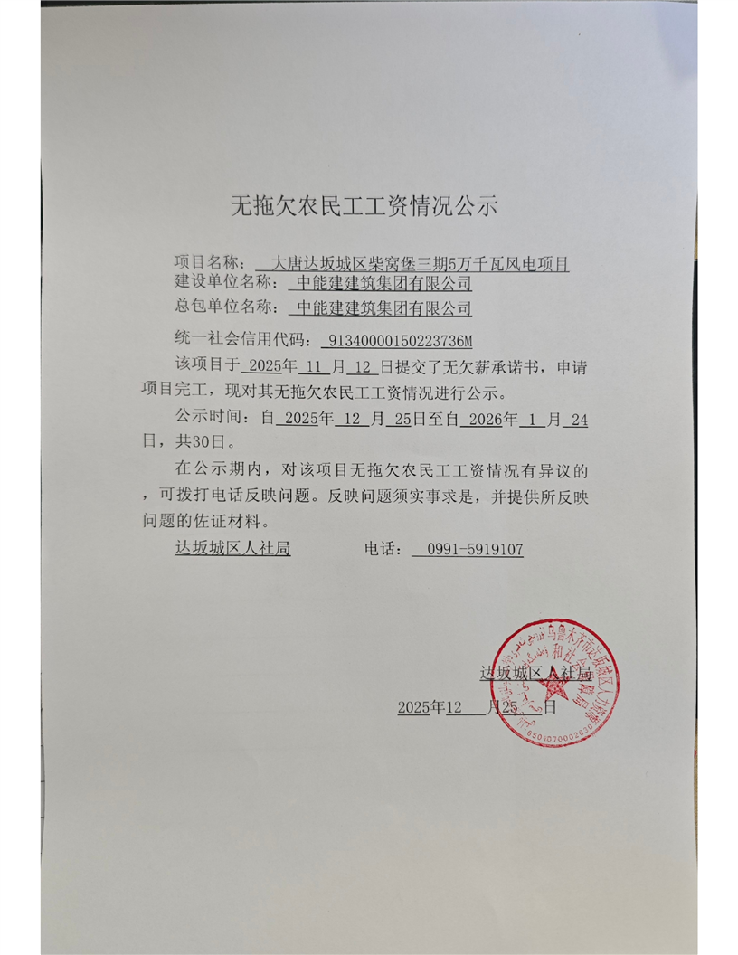 无拖欠农民工工资情况公示(大唐达坂城区柴窝堡三期5万千瓦风电项目)
